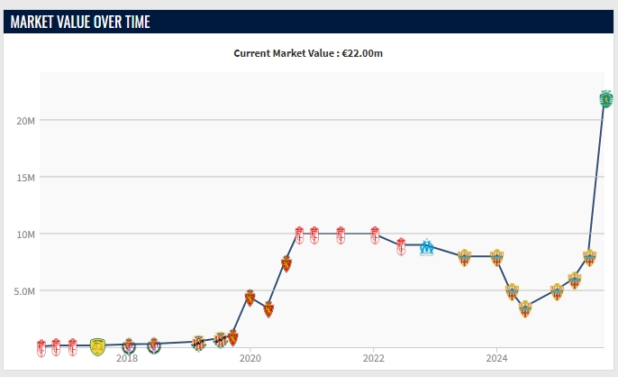 此前球員身價為800萬歐,如今身價暴漲了1400萬歐,漲至2200萬歐。