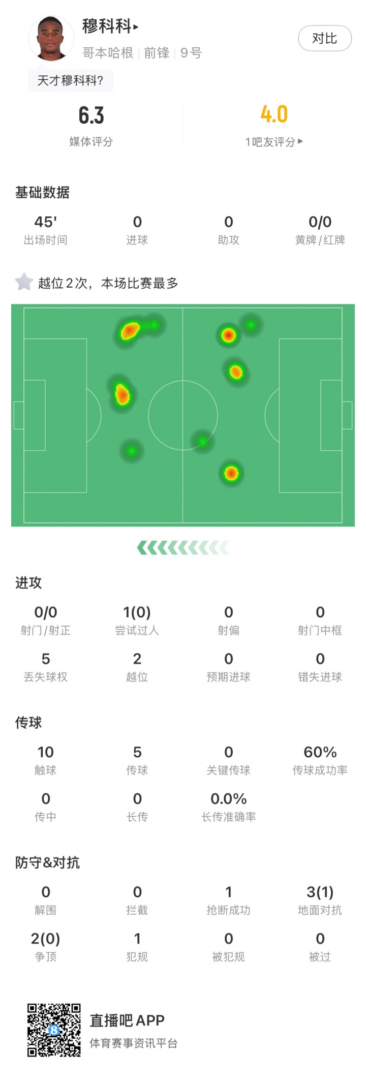效力于哥本哈根的前鋒穆科科此役出戰(zhàn)半場(chǎng)便被換下。半場(chǎng)無(wú)射門(mén)越位兩次,10次觸球,5次傳球,5次丟失球權(quán),傳球成功率60%。